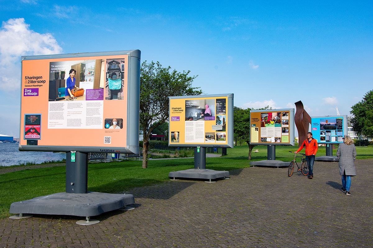 De titel 5 Haringen en 2 liter soep verwijst naar het 5-haringenbord waarmee op de straten in Vlaardingen de anderhalve meter afstand werd uitgebeeld en het initiatief van De Windwijzer om door vele stadsgenoten zelfgemaakte emmertjes soep aan te bieden. De expositie is ontworpen door het Vlaardingse b-creative agency en is tot en met eind juni te bekijken.